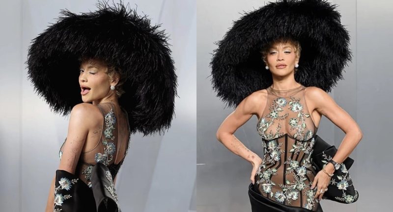 Edhe pse pamja e saj ishte shumë elegante, Rita Ora nuk hezitoi të bëjë humor me kapelen e saj të madhe. Duke folur në tapetin e kuq, ajo tha me shaka se dukej si një llambë dhe se mund të “sillet si pjesë e mobiljeve” brenda festës.