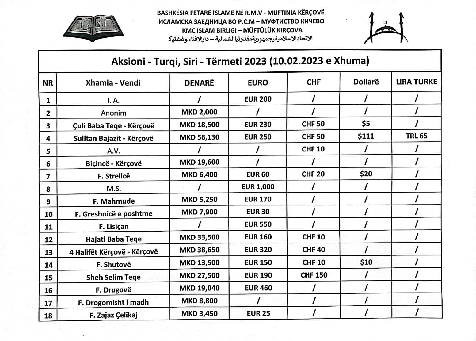 Në aksionin e organizuar ditën e premte nëpër Xhamitë e territorit të Myftinisë së Kërçovës janë grumbulluar 20.918 euro.