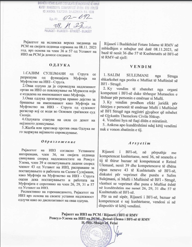 Po ashtu nga detyra u shkarkua edhe Muftiu i Muftinisë së Strugës, Salim Sulejmani, në vend të të cilit u emërua Ushtrues Detyre Mufti i Muftinisë së Strugës Mr. Jusuf Ismaili, deri në zgjedhje të reja.